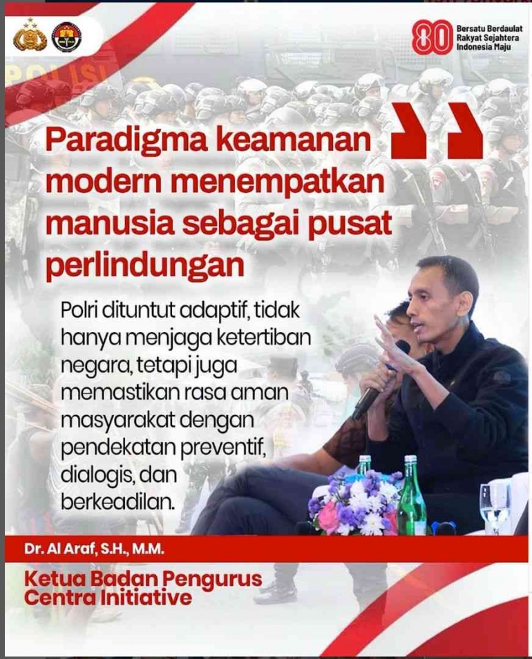 Ketua Badan Pengurus Centra Initiative, Dr. Al Araf, S.H., M.M., menegaskan bahwa paradigma keamanan saat ini tidak lagi hanya berorientasi pada perlindungan negara, melainkan juga pada perlindungan manusia. Menurutnya, Polri memiliki peran strategis dalam mewujudkan transformasi tersebut dengan mengedepankan prinsip-prinsip hak asasi manusia, pendekatan preventif, serta tindakan yang proporsional dan transparan.